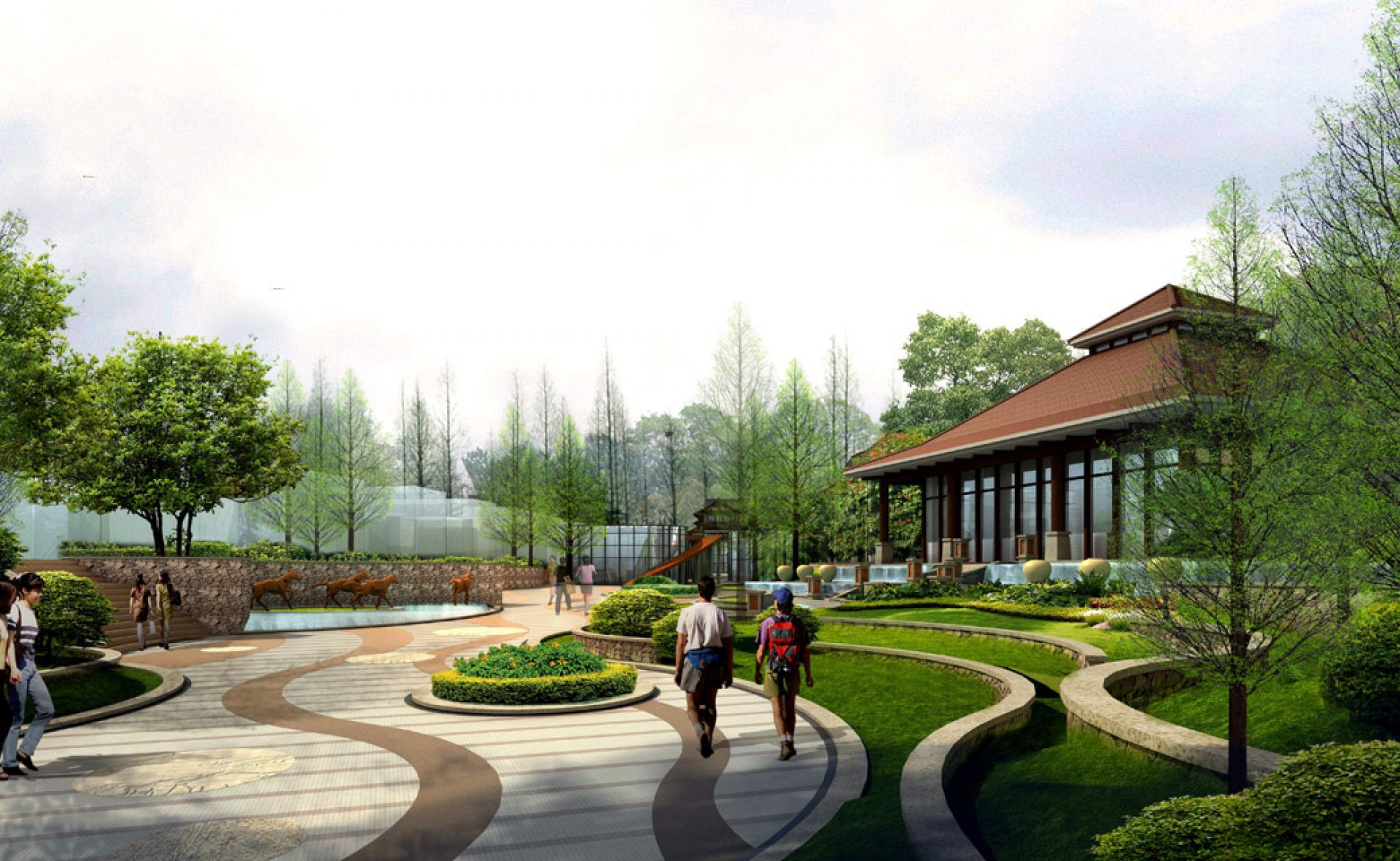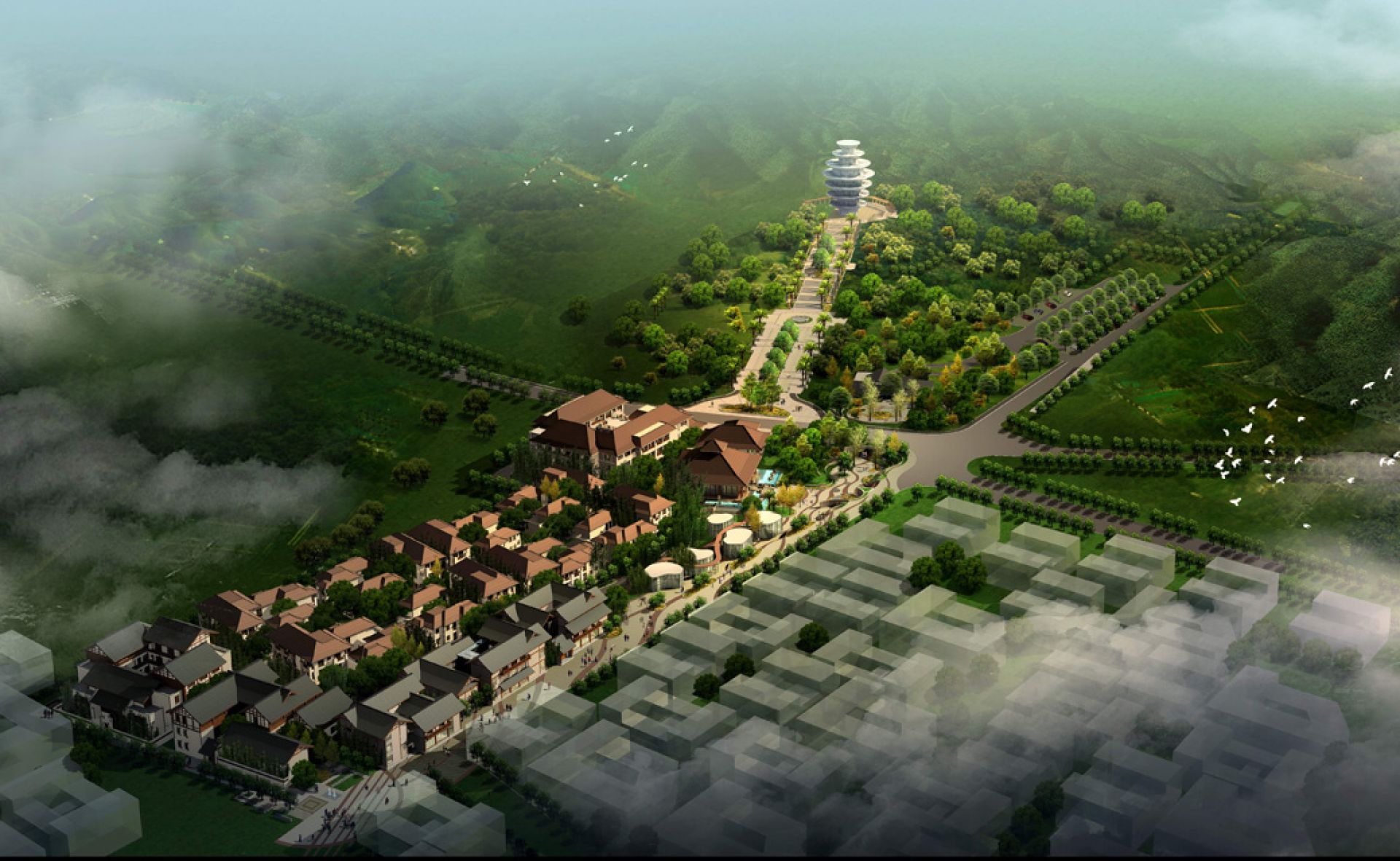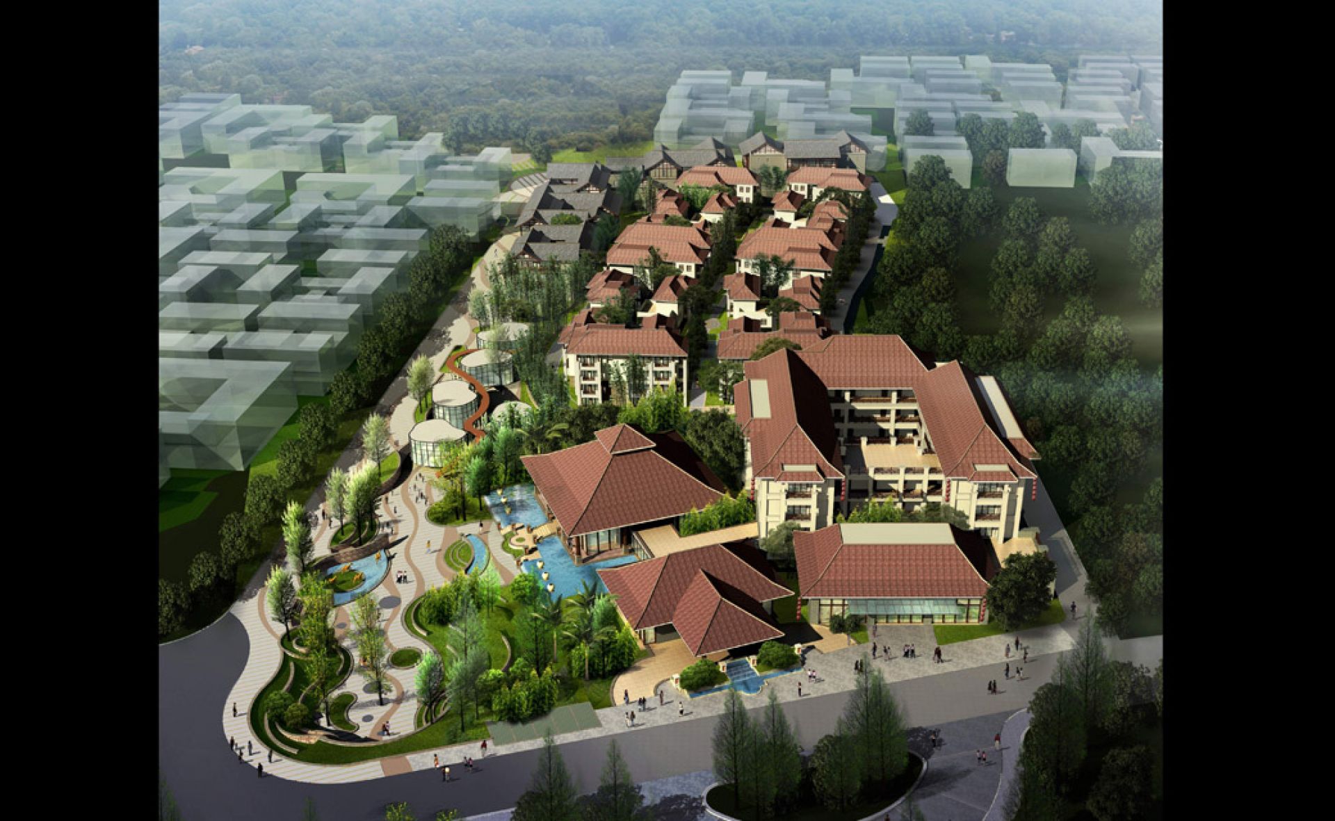 The development incorporates several different Asian styles in the historic township of Pingle.